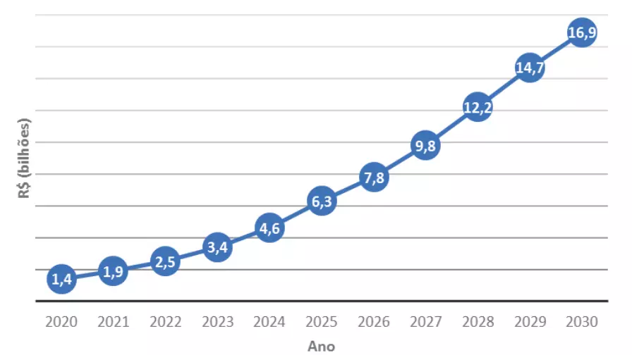Segundo a IHS Markit (2021), o mercado de produtos biológicos de controle no Brasil cresceu a uma taxa anual de 42%. A projeção é que em 2030 este setor alcance R$ 16,9 bilhões, considerando uma taxa de crescimento acumulada CAGR de 35% até 2025 e de 25% até 2030 (Figura 4).