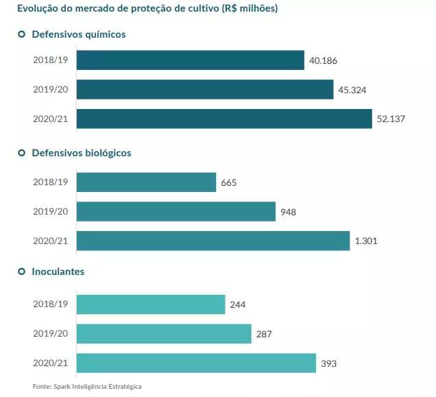 Em relação ao mercado brasileiro, dados da Spark (2021) mostram que o mercado nacional em 2021 foi de R$ 1,3 bilhão para defensivos biológicos e de R$ 393 milhões para inoculantes, representando um crescimento significativo comparado aos anos anteriores (Figura 3).