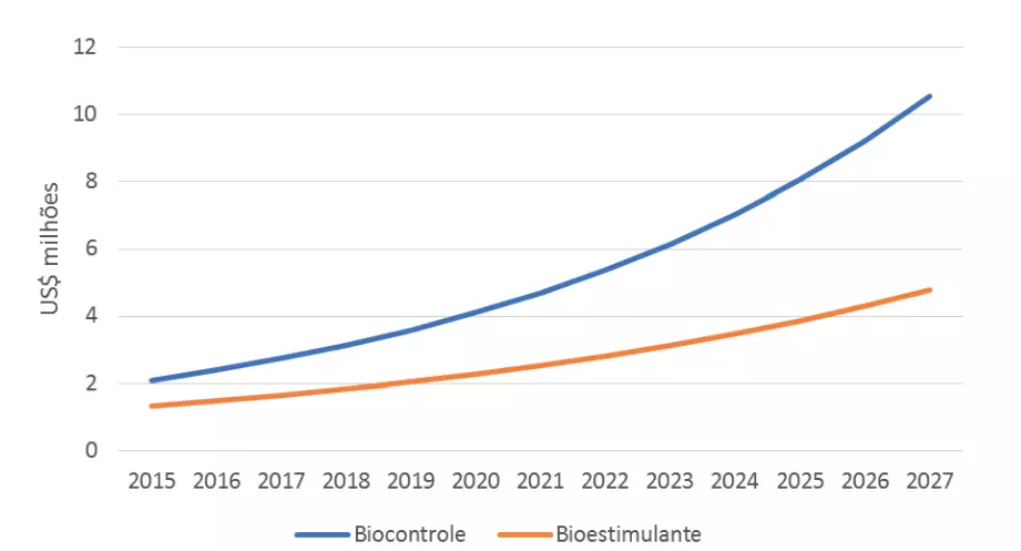 O mercado global de bioinsumos para agricultura, que envolve biodefensivos, inoculantes, bioestimulantes e biofertilizantes, foi estimado em US$9,9 bilhões em 2020, sendo US$5,2 bilhões representados por biodefensivos (IHS Markit, 2021). A expectativa é que, até 2027, o mercado mundial de bioinsumos continue em alta de crescimento, superando US$ 3 bilhões para bioestimulantes e US$ 10 bilhões para biodefensivos (Figura 1).