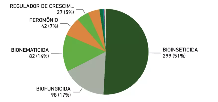 O número de produtos biológicos de controle registrados tem avançado consideravelmente. Um total de 502 produtos com registro ativo foi contabilizado até março de 2022, com destaque para os registros de bioinseticidas, que correspondem cerca da metade dos registros ativos no Brasil (Figura 2).