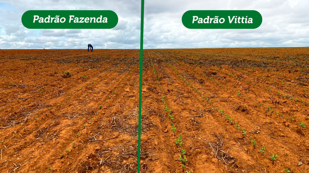 Área de soja com aplicação de No-Nema comparado ao padrão fazenda 7 dias após o plantio em Cristalina-GO – Imagem: Luís Fernando Ribeiro de Carvalho, Vittia.