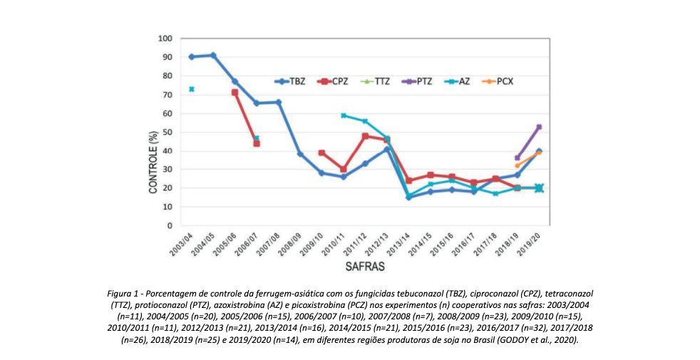 A EMBRAPA monitora desde a safra de 2003/2004 a eficiência das principais moléculas químicas no controle da mais devastadora doença da soja no Brasil, a ferrugem-asiática (Phakopsora pachyrhizi). Neste monitoramento observaram que o controle obtido utilizando alguns fungicidas vem caindo ou apresentando eficiência inferior à 60% (figura 1). Esses resultados reforçam a necessidade de utilizarmos novas ferramentas que venham integra o manejo integrado de pragas e doenças (MIP) e não favoreçam o surgimento de organismos resistentes. Desta forma os produtos biológicos surgem como a alternativa mais óbvia e adequada para cumprir esse papel.